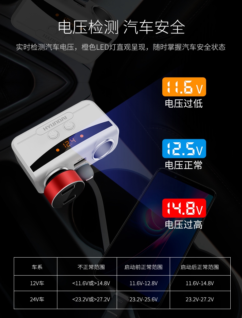 現代車載充電器自動車充電多機能シガラタチプラグusb車用多機能携帯電話を充電して点煙ピアノ黒をサポートします(シガラタタは持っていません)